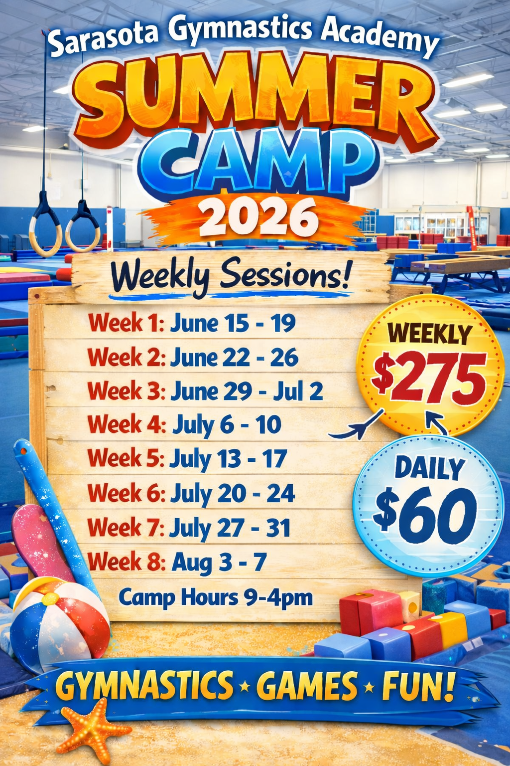 Please call the S.G.A. office (941-377-3344) to register OR e-mail at sarasotagym@gmail.com . Please note that to reserve your place for the week, registration form must be signed and payment in full must be made prior to the week that your child begins camp.